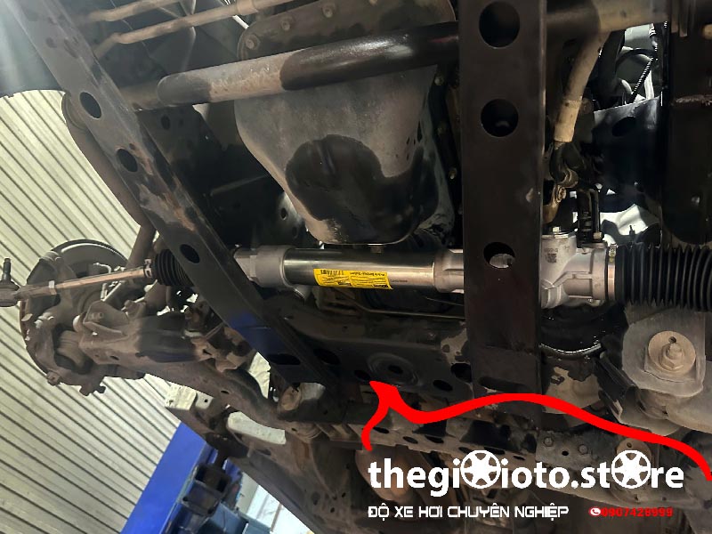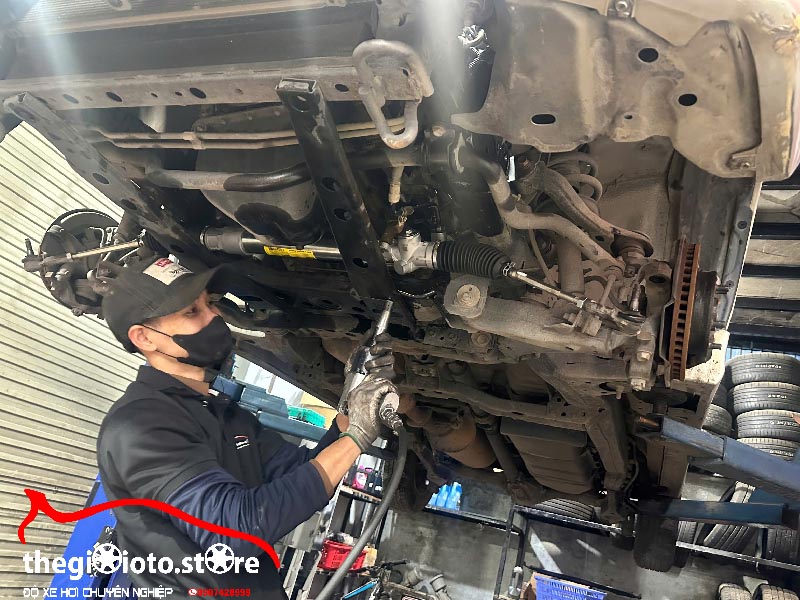 2.Kiểm tra trên cầu nâng: Đưa xe lên cầu, sử dụng đèn soi và thiết bị chuyên dụng để kiểm tra chi tiết giảm sóc, thước lái, cao su gầm, đĩa phanh.