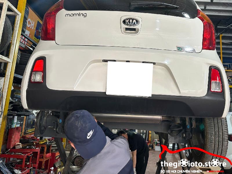 Sử dụng cầu nâng chuyên dụng để nâng xe Kia Morning lên cao.